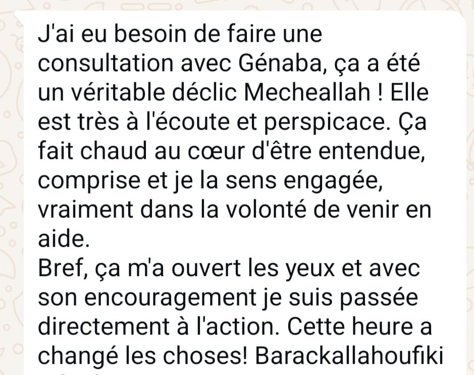 Choisis un créneau où tu seras au calme. Si nécessaire, installe-toi même dans ta voiture, mais accorde-toi ce moment pour me parler de ce qui t’empêche d’avancer sereinement.